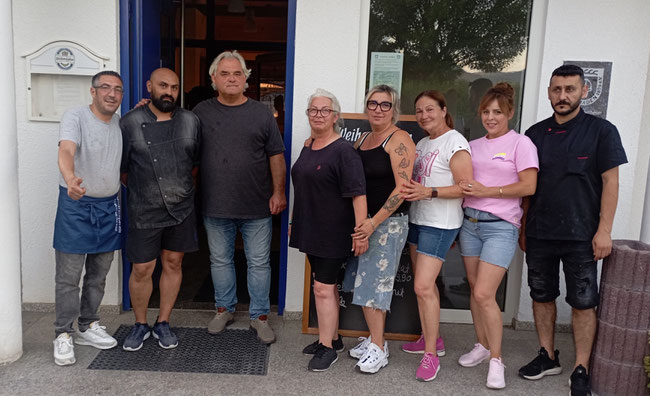 Bilduntertext: Das vor dem Lokal "Zum Brühl" geschossene Erinnerungsfoto zeigt Pächter Daniel Rau (3.v.l.) und sein versiertes Gastro-Team am letzten Arbeitstag vor der dreimonatigen Schließung.